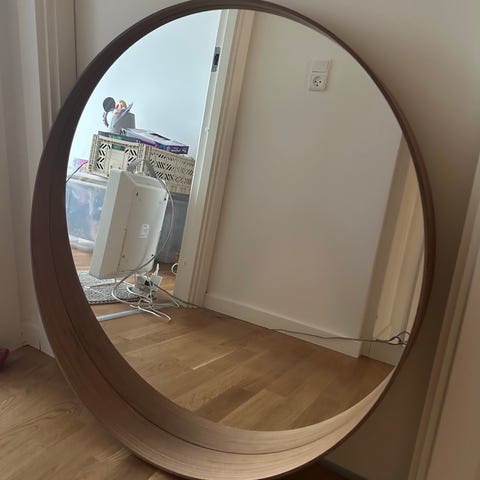 IKEA rundt spejl med træramme. Spejlet har en cirkulær form og en kant i trælook, som egner sig til ophæng i entré, soveværelse eller stue. Velegnet som vægspejl i hjemmet til daglig brug og indretning.
