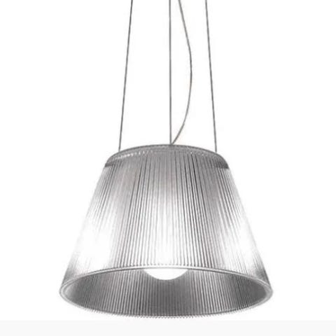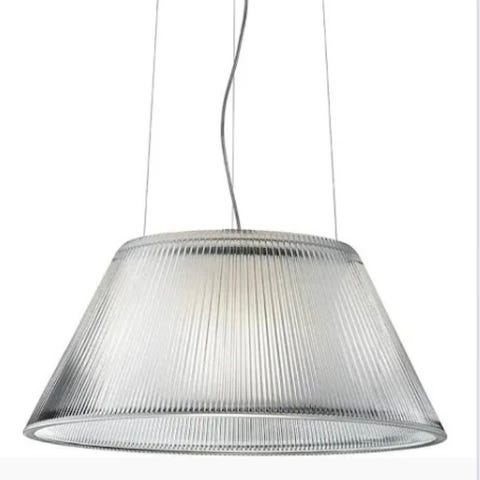 Flos Romeo Moon S1 pendel designet af Philippe Starck. Lampen har en konisk skærm i rillet, transparent glas med matteret inderskærm, som giver et diffust og nedadrettet lys. Ophænget består af loftroset, ledning og wireophæng. Egnet som belysning over fx spisebord, køkkenbord eller i opholdsrum. Modellen anvender udskiftelig lyskilde (fatning og maksimal watt afhænger af den konkrete variant).