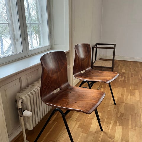 Flotte spisebordsstole fra Galvanitas, modellen S16 Cement Grey / Brown. S16-stolen er en ikonisk, minimalistisk og robust stol med pulverlakeret stålstel og sæde/ryg i brun armoured wood – designet i Holland.