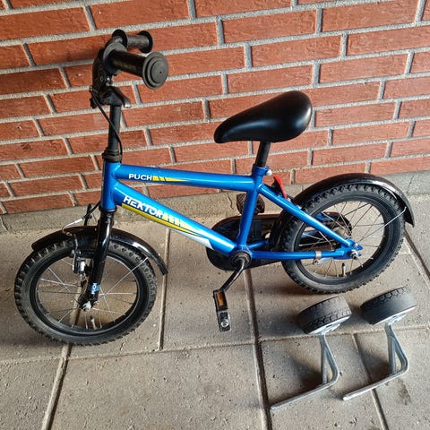 Rigtig god, solid og stort set velfungerende cykel til et barn på 3+ . Min søn er lige fyldt 3,5 på billede nr.2 .
