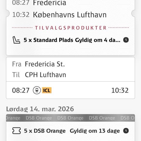 DSB Orange togbillet på standard plads fra København Lufthavn til Fredericia den 14.03 afgang 13.26 ankomst 15.34 Billetten på billedet viser en afgang med 5 x DSB Orange og 5 x standard pladsreservationer.