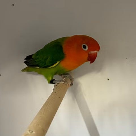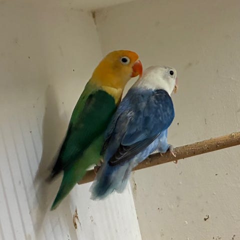 Avlspar. Hannen er viol fra '22, hunnen er Opaline Kobolt Turkis fra '22.