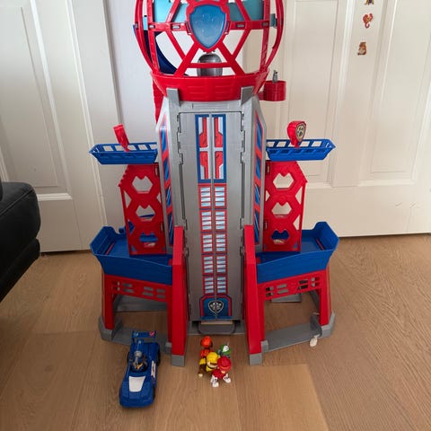 Paw Patrol legesæt med tårn, køretøjer og figurer. Sættet indeholder et større legetårn samt flere små køretøjer og tilhørende figurer fra Paw Patrol-universet. Egnet til rolleleg og fantasileg for børn, der kender serien og dens karakterer. Plastmateriale med forskellige farver på både tårn, biler og figurer.