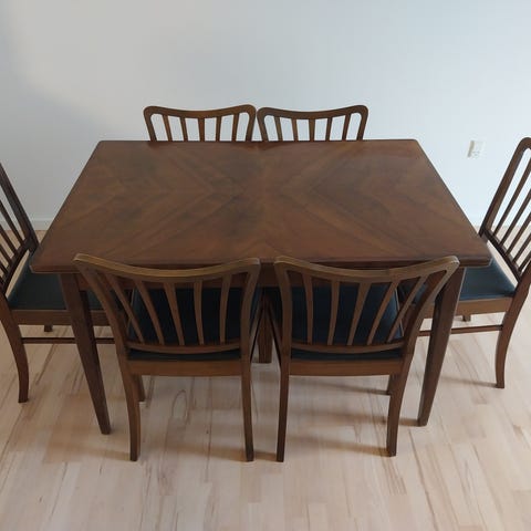 Spisebord med to tillægsplader og 6 tilhørende stole. Bordet er fra 1970'erne. Formodentlig finér.
