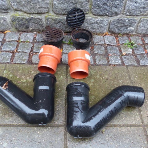 Kloakrør og rørfittings i plast i orange farve. Sortimentet omfatter forskellige samlemuffer og vinkler til brug i kloak- eller afløbssystemer. Egnede til nedgravning og tilslutning af afløbsinstallationer, hvor der kræves plastkomponenter i standard kloakdimensioner.
