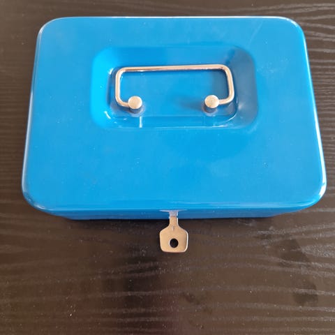 Kontantboks i metal med bærehåndtag og lås med nøgle. Indvendigt er der en plastindsats med flere rum, der kan bruges til sortering af mønter, sedler eller små genstande. Velegnet til opbevaring og håndtering af kontanter eller andre mindre værdigenstande i hjemmet eller på kontoret.