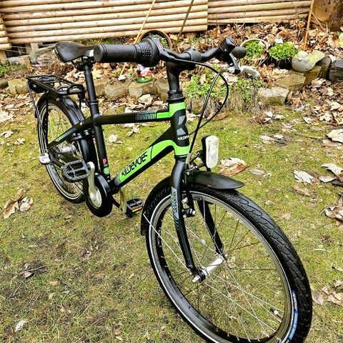 Flot blå efterløbercykel / Tag-along børnecykel, der monteres på et specialbeslag (bagagebærer) på den voksnes cykel (se billede). Bagagebæreren medfølger ikke, men kan købes for ca. 300 kr. 7 udvendige gear i god stand.