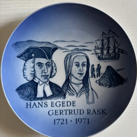 Royal Copenhagen mindeplatte fra 1971, der markerer 250-året for Hans Egede og Gertrud Rasks ankomst til Grønland i 1721.