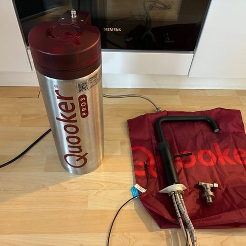 Quooker PRO3-VAQ B kogende vandhane med tilhørende beholder. Sættet består af Quooker beholderen PRO3-VAQ B i rustfrit stål med tilslutningskabler samt en buet køkkenarmatur-tud i messing med betjeningsgreb og tilslutningsslanger. Systemet er beregnet til installation under køkkenvask til levering af kogende vand direkte fra hanen. Velegnet til køkkenbrug, hvor der ønskes hurtig adgang til varmt og kogende vand.