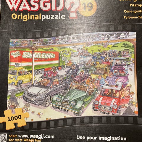 Wasgij Original Puzzle 19 Cone-gestion puslespil. Motivet viser en tegnet trafiksituation med biler og personer i kø. Puslespillet er en del af Wasgij-serien, hvor man ikke lægger billedet på æsken, men i stedet skal forestille sig en anden scene ud fra motivet. Velegnet til voksne og større børn, der kan lide udfordrende puslespil med humoristiske illustrationer.