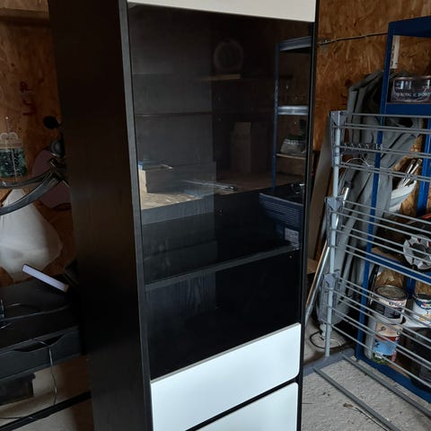 Vitrineskab & vægskab med skydelåger i hvidt finish. Skabet står på ben og har en yderligere sektion, der enten kan stå ovenpå eller væghænges. Hver sektion er 35,5 cm højt. Neutralt design, der passer ind i mange indretninger. Brugt, men brugbart til mange formål - børneværelset, sommerhuset, skuret, gæsteværelset, el. lign.