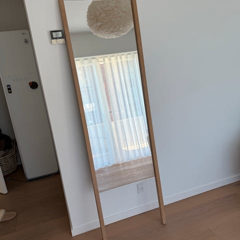 “Fritstående” Bolia spejl (Shift) med integreret hylde og træfod i egetræ. Spejlet er fuldlængde, egnet til for eksempel entré, soveværelse eller bryggers. Hylden giver mulighed for placering af mindre genstande som nøgler eller tilbehør. Designet er minimalistisk og funktionelt med spejlflade over hele fronten og en diskret trædetalje i bund.