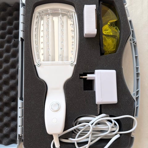 Handheld Laser Device laserapparat, håndholdt model i hvid plast. Enheden har laserhovede med flere dioder og betjeningsknap på forsiden. Leveres i opbevaringsetui med strømforsyning og beskyttelsesbriller i separat etui. Egnet til hjemmebrug, hvor der ønskes målrettet laserlysbehandling på mindre områder af kroppen. CE-mærkning fremgår af apparatet.