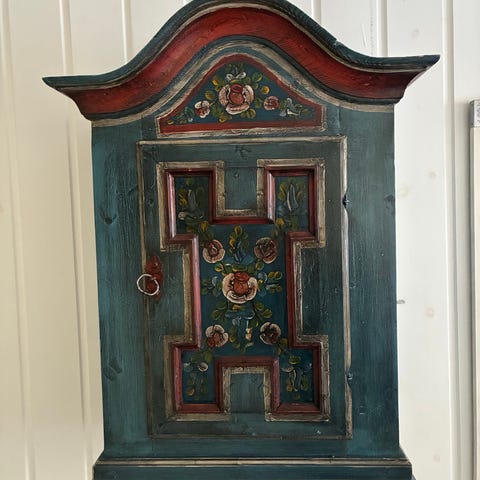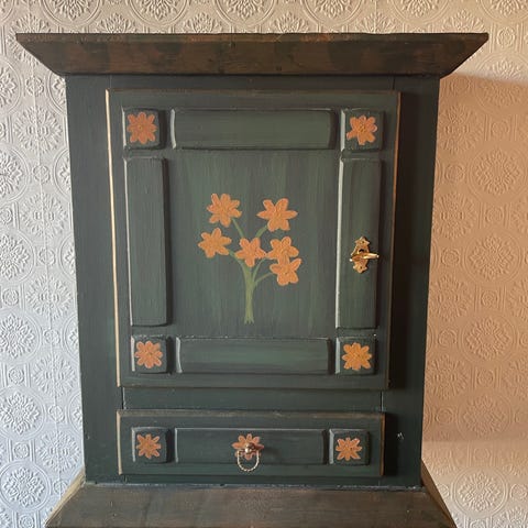Vægskab i træ med malet blå/grøn og beige overflade samt dekorative motiver og årstallet 1846 på toppen. Skabet har et centralt skabsrum med låge og to sideafsnit med hver sin låge. Der er en mindre skuffe nederst i midten. Fronten er udsmykket med enkle symboler og stafferinger i mørke og gyldne nuancer. Skabet er egnet som opbevaringsmøbel og dekoration på væg i fx stue, gang eller køkken.