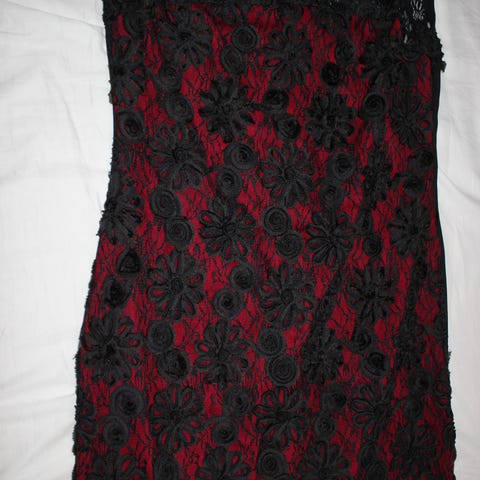 Sort Lacony Paris kjole i str. L med blomster på. 3/4 ærmer og knælang.