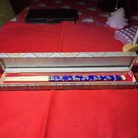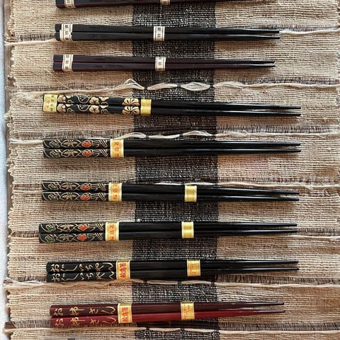 Two sets of chopsticks, wooden and lacquered. Made in Japan.