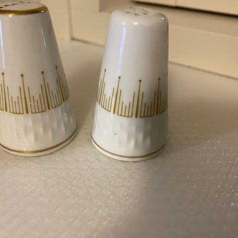 Fint, klassisk vintage salt og peberbøsse sæt i porcelæn af mærket Edelstein, Marselisborg. I fin stand uden skår og mærker udover almindelig patina.
