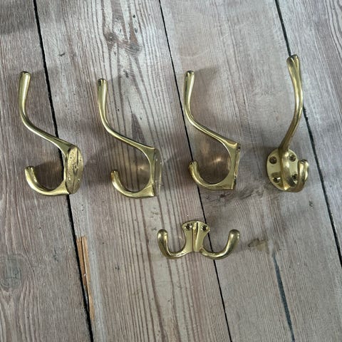 3 stk. ældre knager af massiv messing. Har en del år på bagen men er alle 3 i rigtig pæn stand med mindre patina. Kan evt. pudses for et mere gyldent udtryk. Tunge og massive. Sælges KUN samlet og prisen er for alle 3 stk.