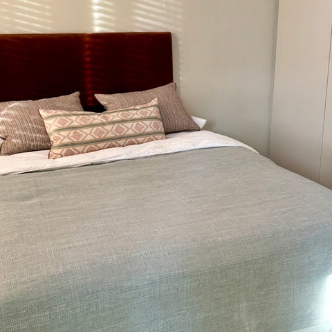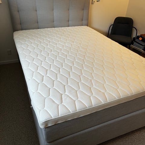 Boxmadras med sorte stålben og sort sengegavl. Købt i Dræmmeland.