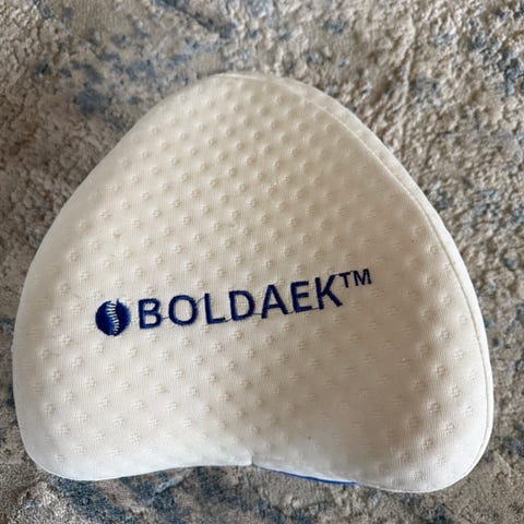 Boldaek ortopædisk benpude i hvid. Puden er formet til at ligge mellem benene og kan bruges i sengen eller på sofaen for at støtte ben og knæ under hvile eller søvn. Ydersiden har en struktureret overflade i tekstil, og puden er beregnet til voksne brugere uanset køn.