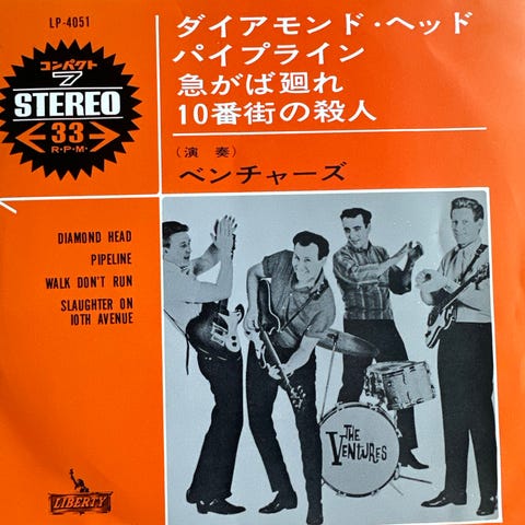 The Ventures Secret Agent Men EP vinylplade i 7" format. Udgivelse på Liberty Records med titlen "Secret Agent Men". Pladen er en 45 rpm extended play med flere numre, herunder "Secret Agent Man", "Get Smart", "The Man From U.N.C.L.E." og "Hot Line". Cover med sort/hvidt foto af bandet på blå baggrund og trykte tracklister på bagsiden. Velegnet til samlere af surfrock og 60’er-EP’er på vinyl. ingen ridse