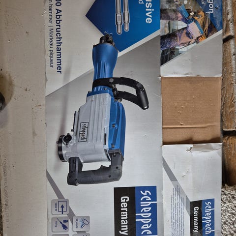Nedbrydningshammer, brug til nedbrydning af betondæk i to mindre badeværelser. Meget effektiv. Medfølger alt originalt, herunder både spidst og flad mejsel. Kvittering haves ikke.