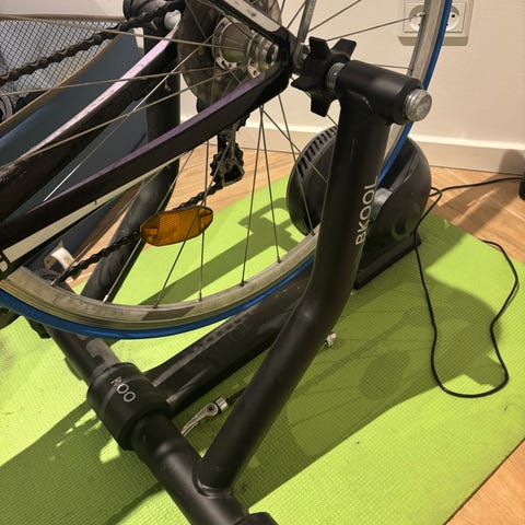 Bkool hometrainer cykeltræner til indendørs træning. Enheden fungerer som en stationær træner, hvor baghjulet monteres i rammen. Egnet til brug med racercykel eller anden cykel med kompatibel bagaksel. Leveres med strømforsyning som vist på billedet. Velegnet til struktureret cykeltræning indendørs og simulering af udendørs kørsel via kompatibel software, afhængigt af model og tilslutningsmuligheder.