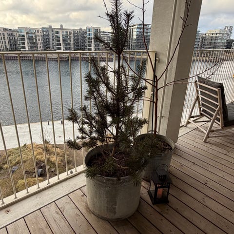 Æbletræ i stor zink krukke, som er købt hos en antikhandel for 600 kr