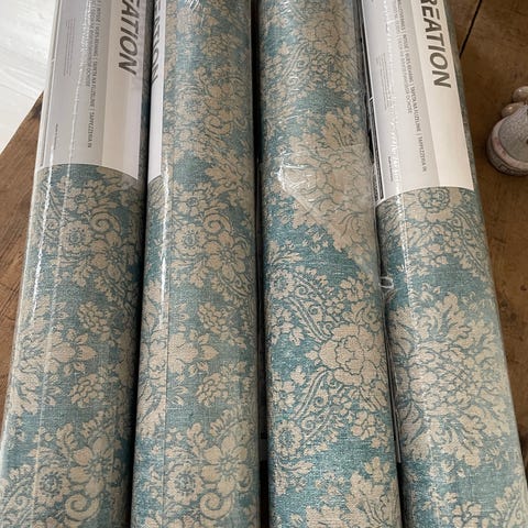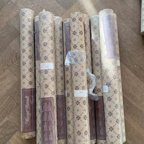Papirtapet, kan dægge ca. 5,5 kvadrat meter. Rest fra eget projekt (billede nr.2). Dejligt kraftigt tapet i god kvalitet, let at arbejde med. Mønster Unniko Green. Udgået produkt. Der er næsten en rulle. Ny pris for en rulle er ca. 1000,- Kan efteraftale hentes på Sydfyn eller Fredericia.