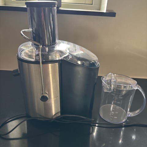 Braun saftpresser i hvid plast med gennemsigtige dele. Enheden har påfyldningsrør, presserstempel, aftagelig juicekande med håndtag samt integreret si og riveindsats i metal. Egnet til presning af frugt og grøntsager i husholdningen. Aftagelige dele gør rengøring lettere, og saftpresseren tilsluttes almindelig stikkontakt.