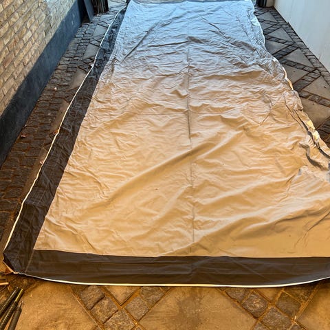 ISABELLA ECLIPSE G18 FRONTSOLSEJL MED CARBONX STEL til campingvogn i grå farve. Sættet omfatter teltdug, stænger og diverse tilbehør som barduner og smådele, samt brugsanvisning. Velegnet som sol- og regnskærm foran campingvogn, hvor det giver overdækket opholdsareal. Modellen monteres på campingvognens forteltsskinne eller direkt på campingvogn.