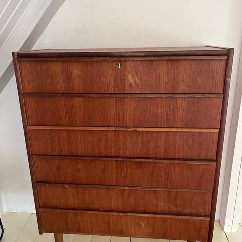 Fin og funktionel kommode i teak med 6 skuffer. Klassisk skandinavisk design med integrerede greb og slanke ben. Velegnet til opbevaring af tøj, sengetøj eller lignende.