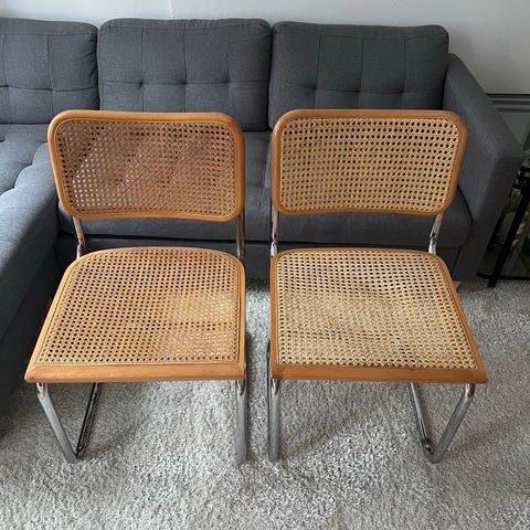 Stolene er brugt, men står pænt. Enkelte steder er flettet gået op. Der medfølger 4 hynder i beige.