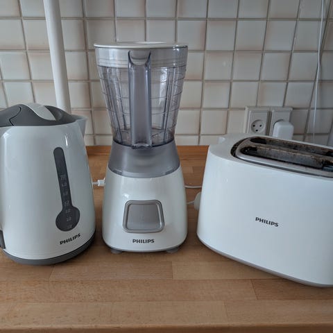 Philips knivsliber i brun og hvid plast, betjenes via en kontakt på fronten. Enheden tilsluttes med almindelig netledning med stik.