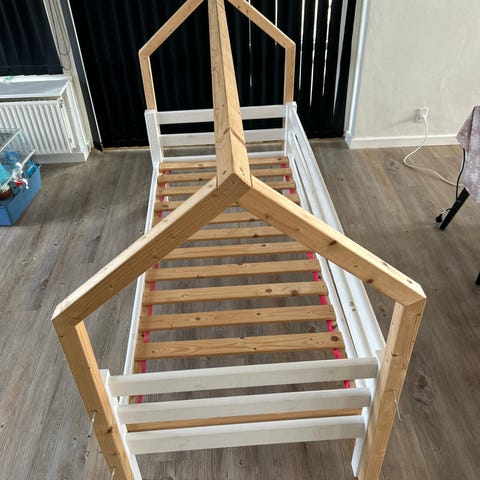 Hvid hus-seng i massivt fyrretræ fra VidaXl. Anvendt i 1 1/2år, og har minimale brugsspor.