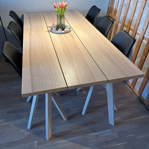 Det fremstår i pæn stand med almindelige brugsspor. Derudover er der to skrammer i bordpladen (se billeder).