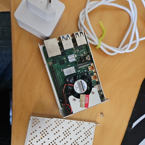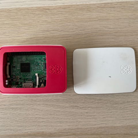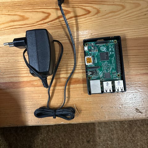 Raspberry Pi Model B single-board computer med sort kabinet, strømforsyning og 16GB microSD-kort.
