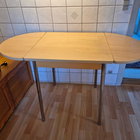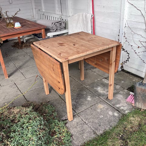 Rigtig fint og praktisk træ klapbord, som bliver ganske stort når det er slået ud, så kan også fungere som spisebord.
