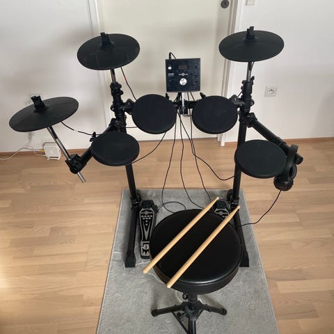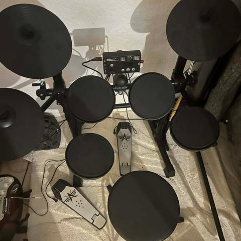 Elektronisk trommesæt med flere trommepads, bækkener og to pedaler. Sættet omfatter kontrolmodul, hi-hat- og stortrommepedal. Det kan både kobles til hovedtelefoner, højtaler og med input fra eksterne lydkilder. Velegnet til øvning derhjemme.