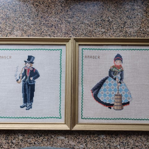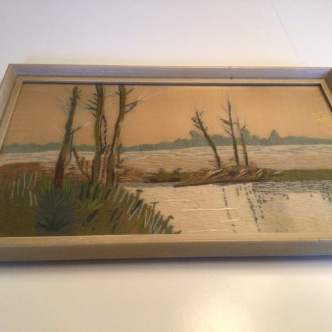Et fint broderi , hvor billedet er en gammel gård med stråtag , stort træ og blomster , der erogså to høns og en vandkande , er i en fin guld ramme m( en sort streg ) , m /glas , mål 37 x 32 cm , Søgeord ! Samler, pynt, dekoration, Deco, indbo, indretning, retro, vintage, SENDER KUN MED DAO ELLER AFHENTNING.