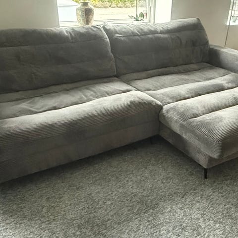 Lækker stor flydesofa i farven Caffe latte. Den er sparsomt brugt, da den har stået i vores sommerhus som nu er solgt. Chaiselong: 160 cm dyb - 105 cm bred.