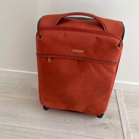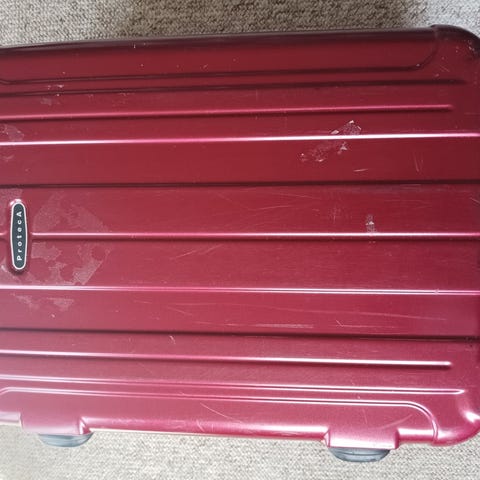 Kufferten har udvendigt synlige brugstegn i bunden.
