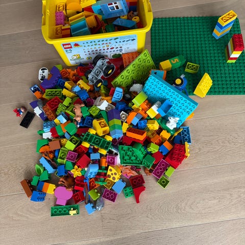 LEGO DUPLO klodser blandet. Forskellige DUPLO-klodser i flere farver og former, almindelige byggeklodser, specialklodser, køretøjsdele, døre, vinduer og figurer.
