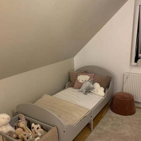 IKEA udtræksseng børneseng i lyserød. Sengen er en udtræksseng, der kan justeres i længden efter barnets højde. Høj gavl ved hovedenden og sider giver afskærmning. Velegnet som overgangsseng fra tremmeseng til større seng. Passer til madras i justerbar længde (se mål på tegningen). Egnet til børneværelse, gæsteværelse eller som ekstra seng.