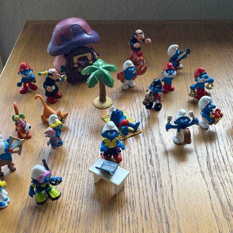 Smølfer med flere små plastikfigurer samt et svampehus.
