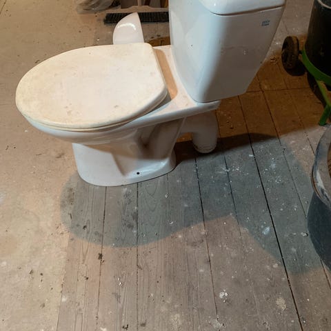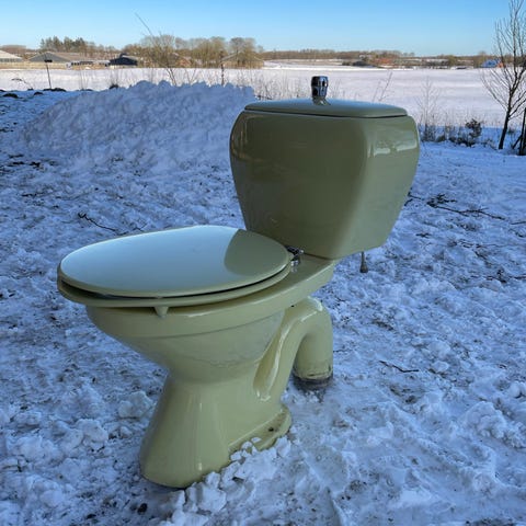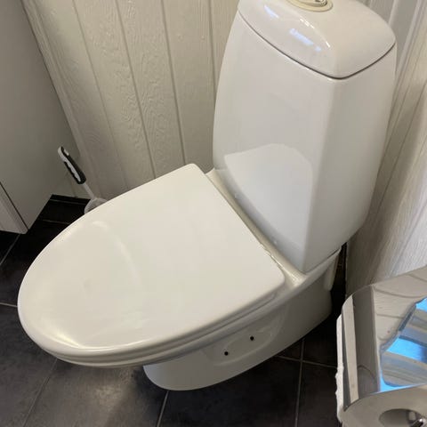 Toilet blå med cisterne og toiletsæde