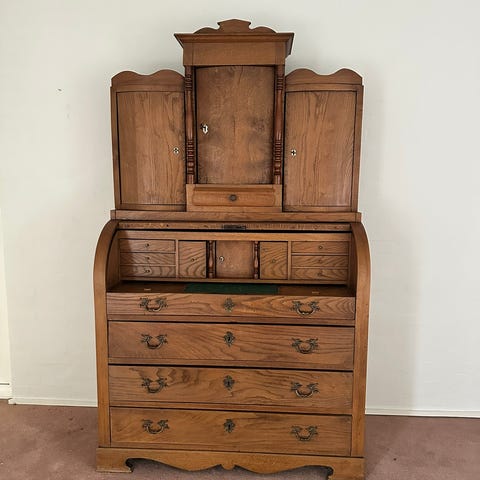 Chatol med overskab i mahogni. Der er indbygget klap med grøn læder, så det kan bruges som skrivebord. 5 skuffer i alt. Fremstår flot og velholdt med flotte detaljer og få brugsspor. Mål: D:46(85 udslået), B:96, H: 214.