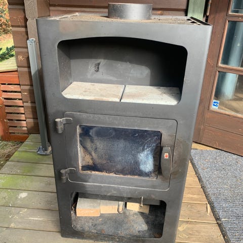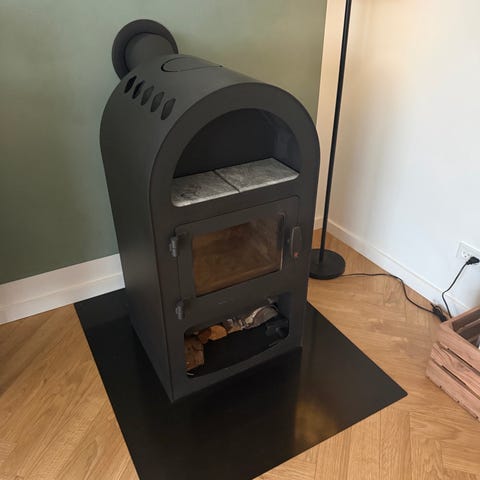 ABC brændeovn i sort stål. Kompakt, firkantet model med frontlåge og glasrude, så ilden kan ses under brug. Nederst på fronten er der luftregulering med drejespjæld. Brændeovnen har røgafgang i toppen. Velegnet som varmekilde i fx stue, sommerhus eller værksted, hvor der er korrekt skorstenstilslutning og godkendt installation.