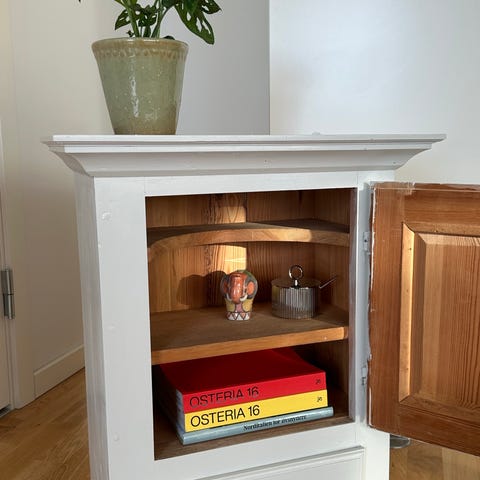 Fint lille væghængt skab. Der er hængsler til at hænge det op. Nymalet, med original nøgle.