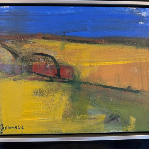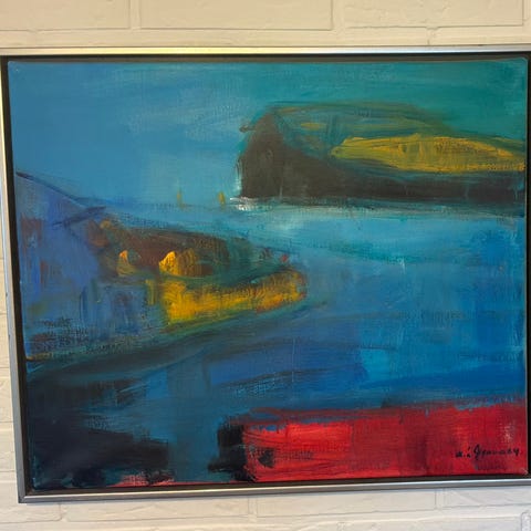 RESERVERET Smukt maleri med abstrakt landskabsmotiv i blå og gule nuancer af den afdøde kunstmaler Maiken á Grømma (1956-2016)